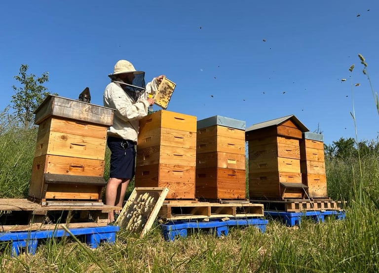 << Ma passion est née pendant la pandémie du Covid. J'aime être à l’extérieur, dans la nature. Je n’arrive pas à rester chez moi et l'apiculture ma toujours intéressé. Je me suis instruit et inspirer jusqu'à l'achat de ma première ruche, puis après de nombreuses piqures, j'ai évolué et avec l'aide de ma famille je me suis amélioré, je possède aujourd'hui plus de 11 colonies dispatchée sur trois site différents du Haut Rhin en France : à Feldbach, à Roppentzwiller et à Courtavon. >>